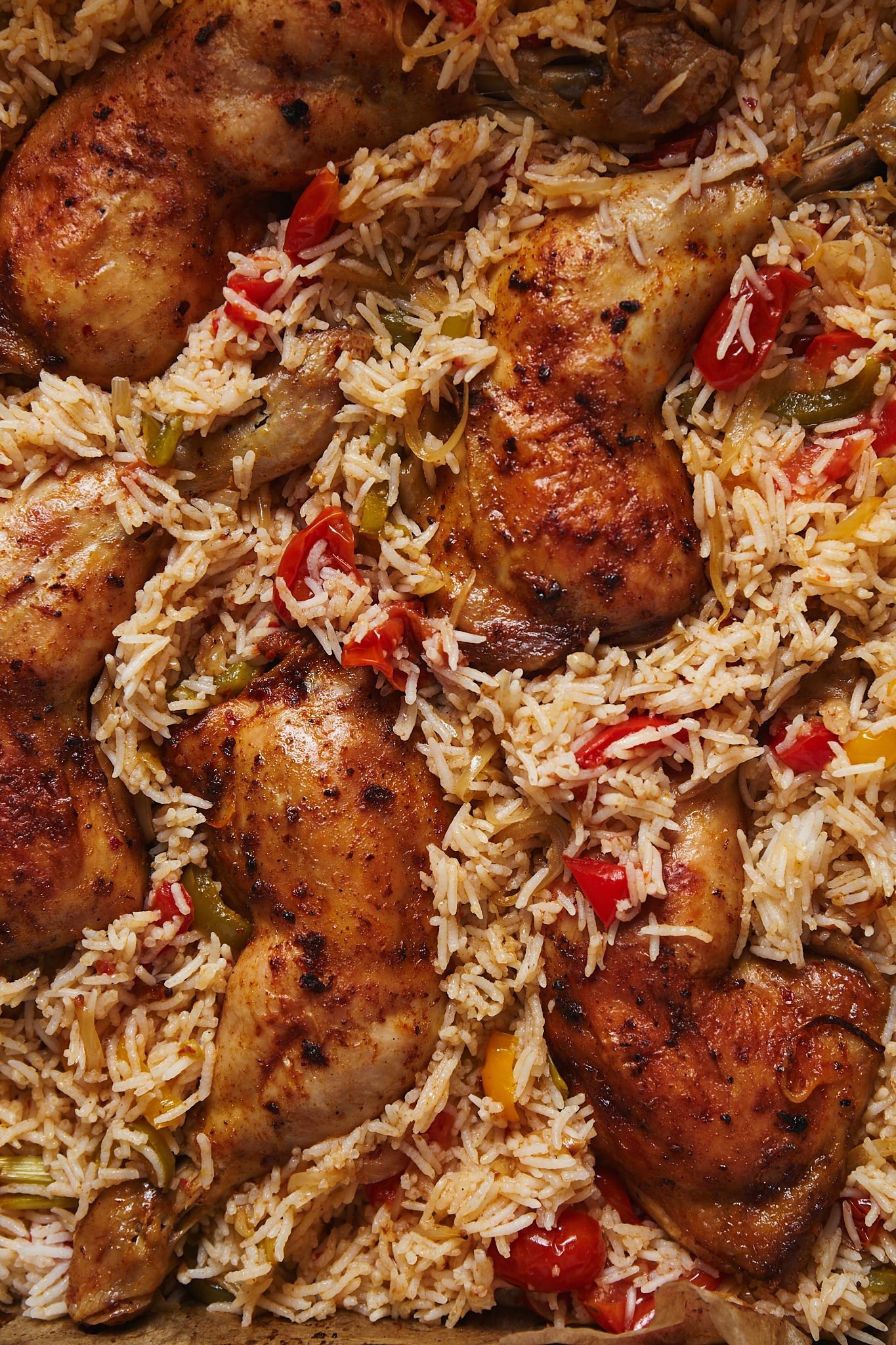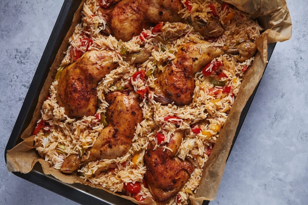 - Once your chicken and vegetables are ready, remove chicken from the tray and mix your cooked rice with the veggies and all the juices. Make sure you mix everything properly to incorporate all the flavours together. Add your chicken back in the tray until ready to serve.